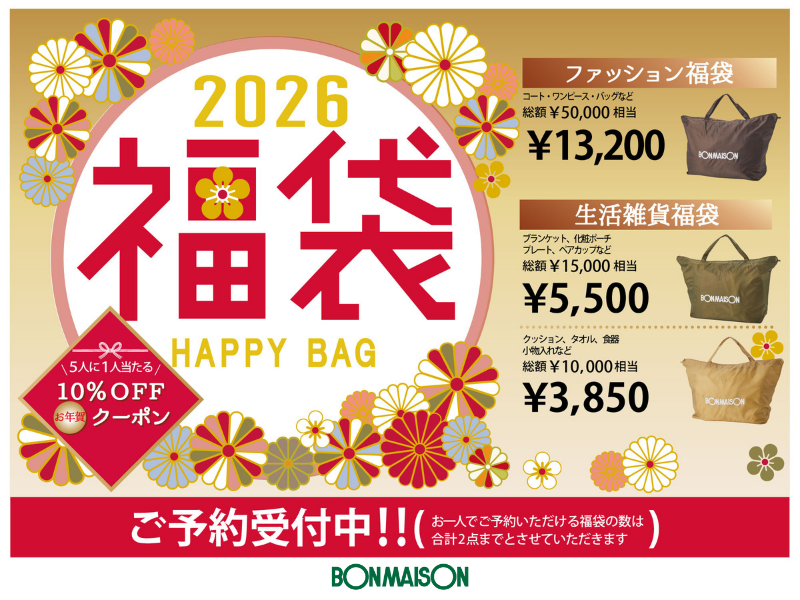 2026福袋 ご予約受付中!! 2025年12月1日 お知らせ 毎年大人気のボンメゾン福袋のご予約が、本日12月1日より開始します。 ご予約は店頭での申し込みで おひとり様2点までとさせていただいております。 数に限りがございますので、お早めに店頭へお越しください。 お待ちしております!